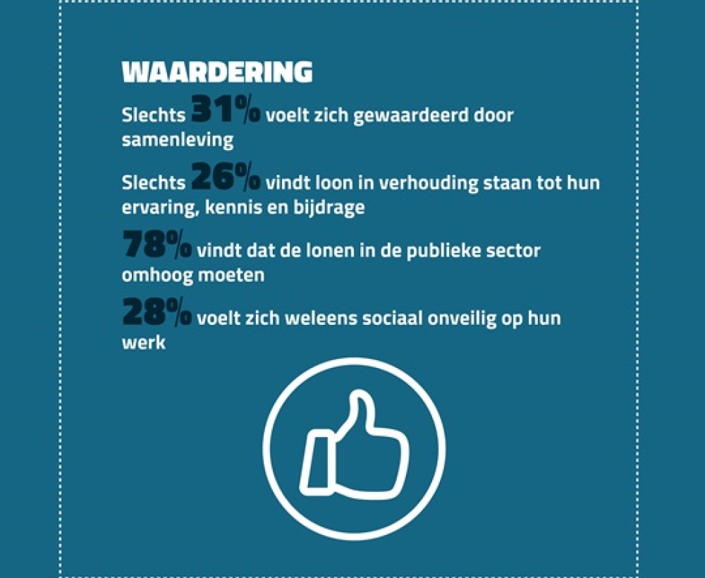 Hoe ervaren de bijna 3 miljoen werkenden in de publieke sectoren hun werk en wat zijn de belangrijkste knelpunten die zij hierbij ervaren? Deze twee vragen vormden de rode draad in een enquête van de Algemene Centrale van Overheidspersoneel (ACOP), het samenwerkingsverband van de MARVER, AFMP, FNV, AOb en NPB. In totaal 11.506 respondenten uit de sectoren Defensie, politie, onderwijs, openbaar bestuur en overheid, door de overheid gefinancierde media en cultuur, zorg en welzijn vulden hiervoor een vragenlijst aan de hand van 17 stellingen in. Naar aanleiding van de vandaag gepubliceerde bevindingen, die zijn vastgelegd in het onderzoeksrapport ‘Publieke sector in focus: werknemerservaringen, knelpunten en aanbevelingen’, delen wij hieronder een aantal opvallende conclusies en statistieken.